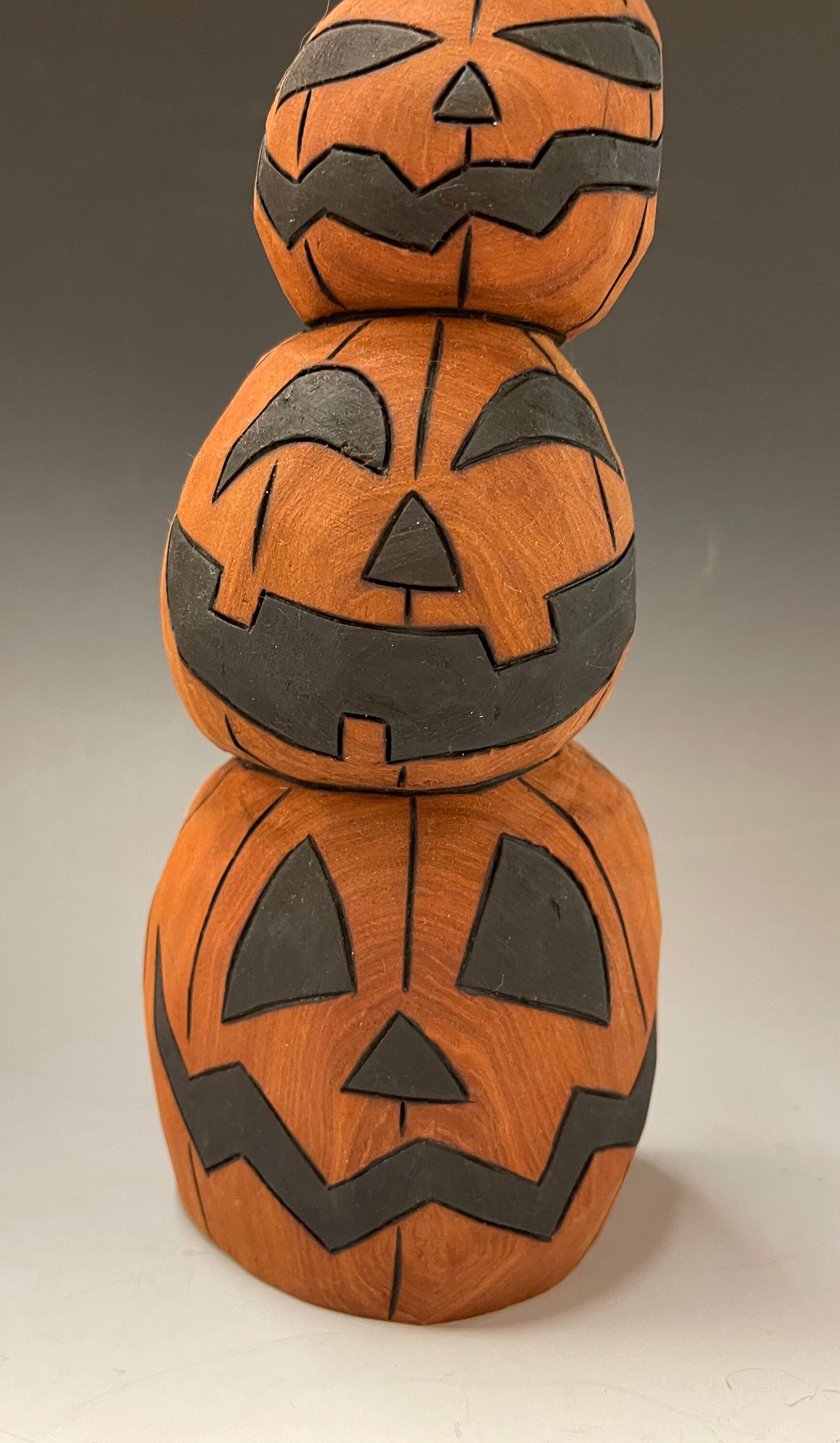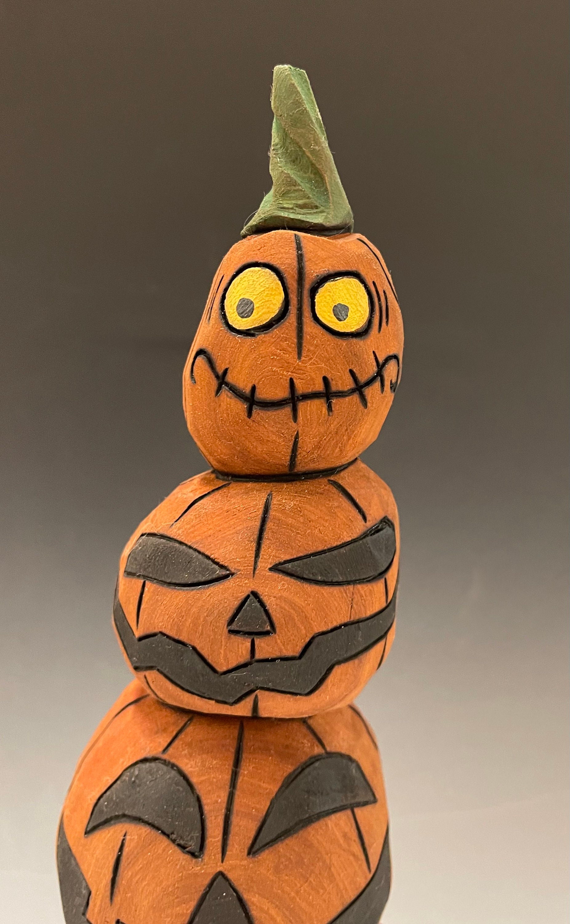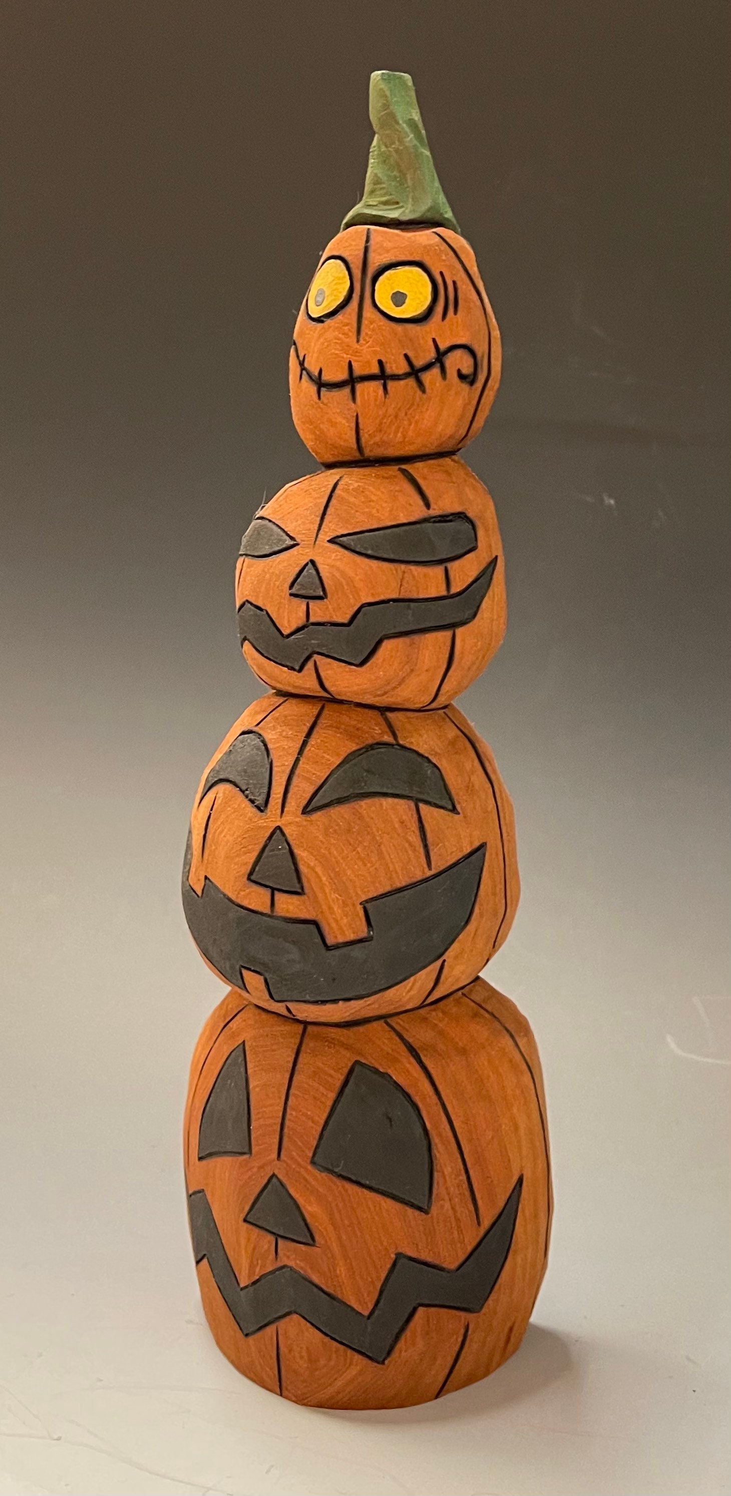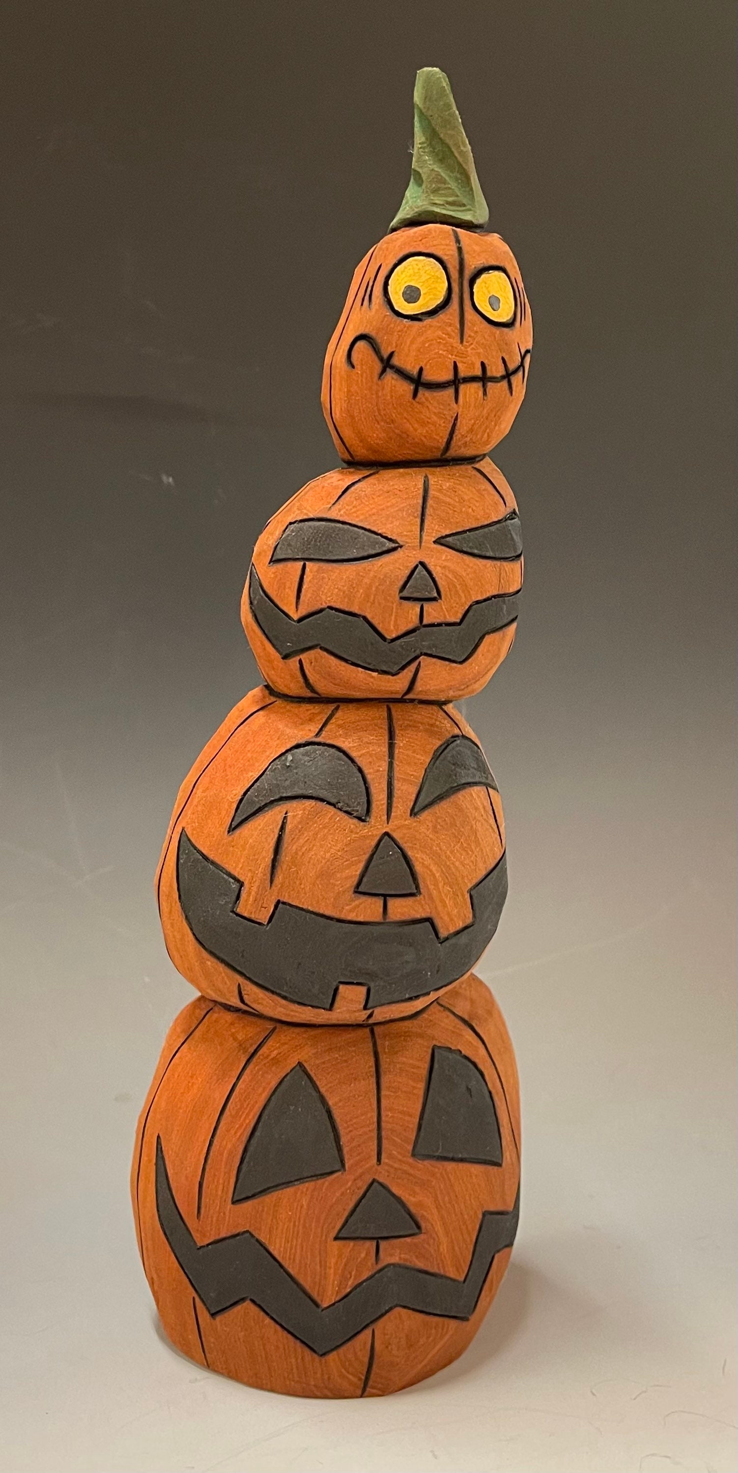 This piece is a hand carved crooked Jack-O-Lantern stack.