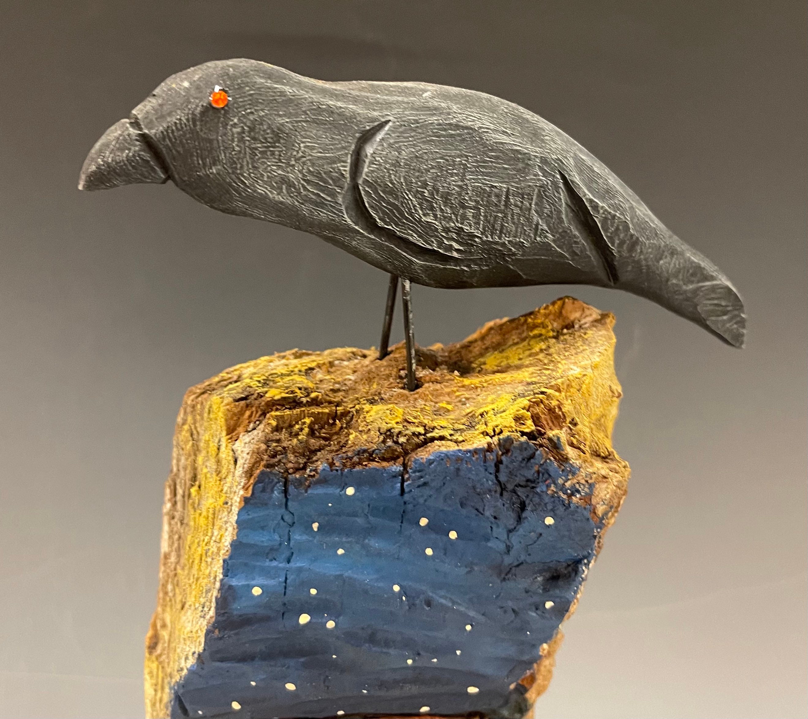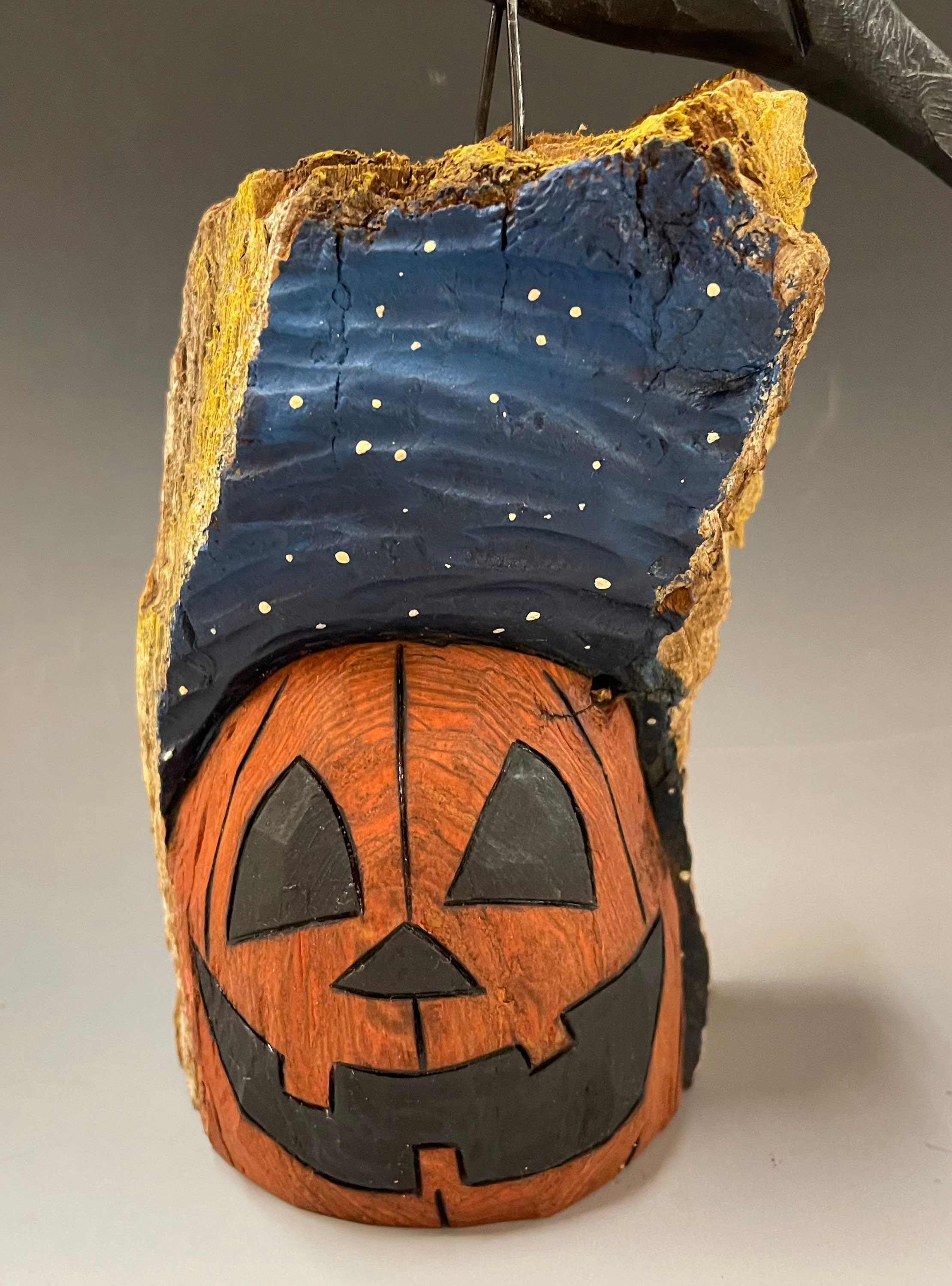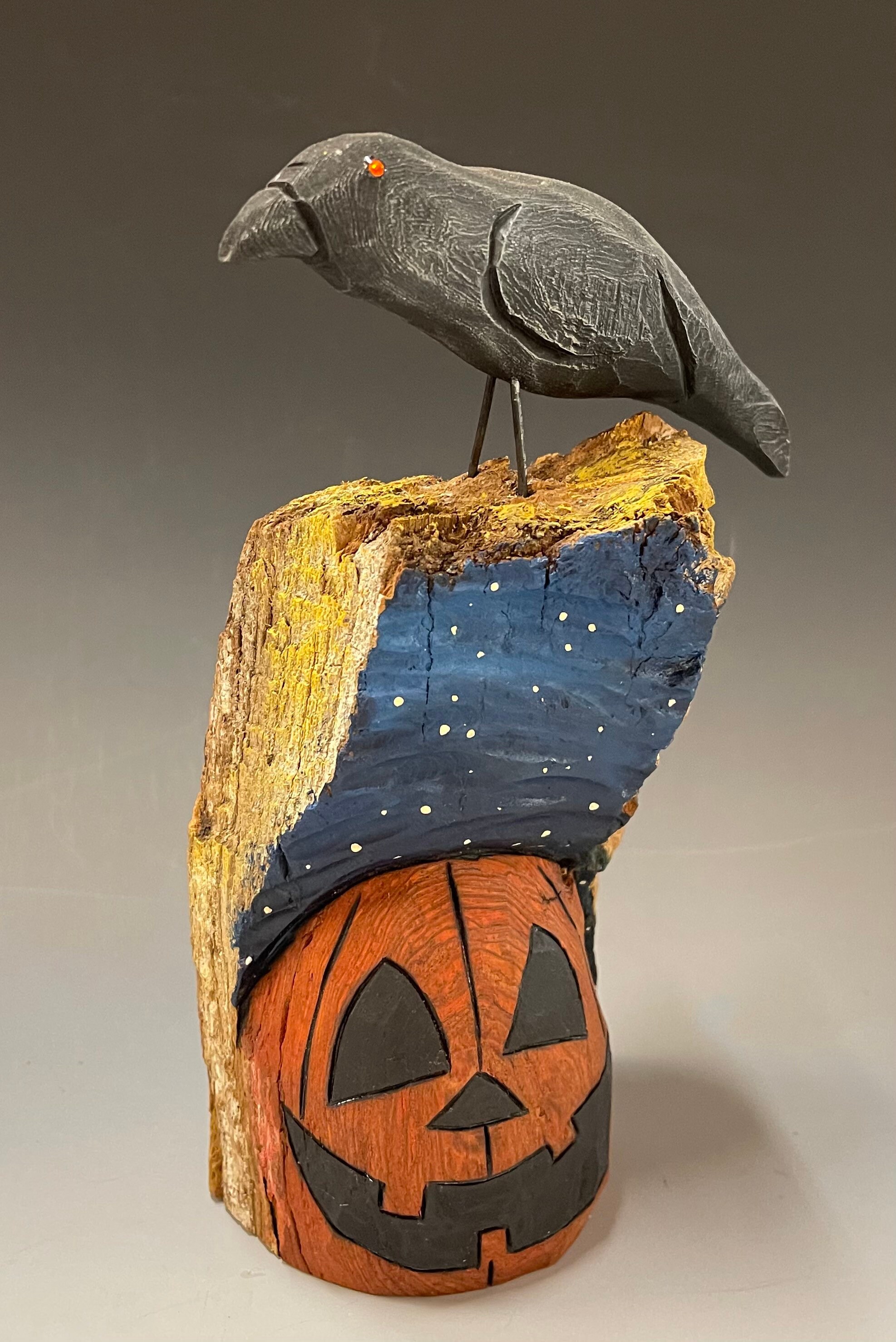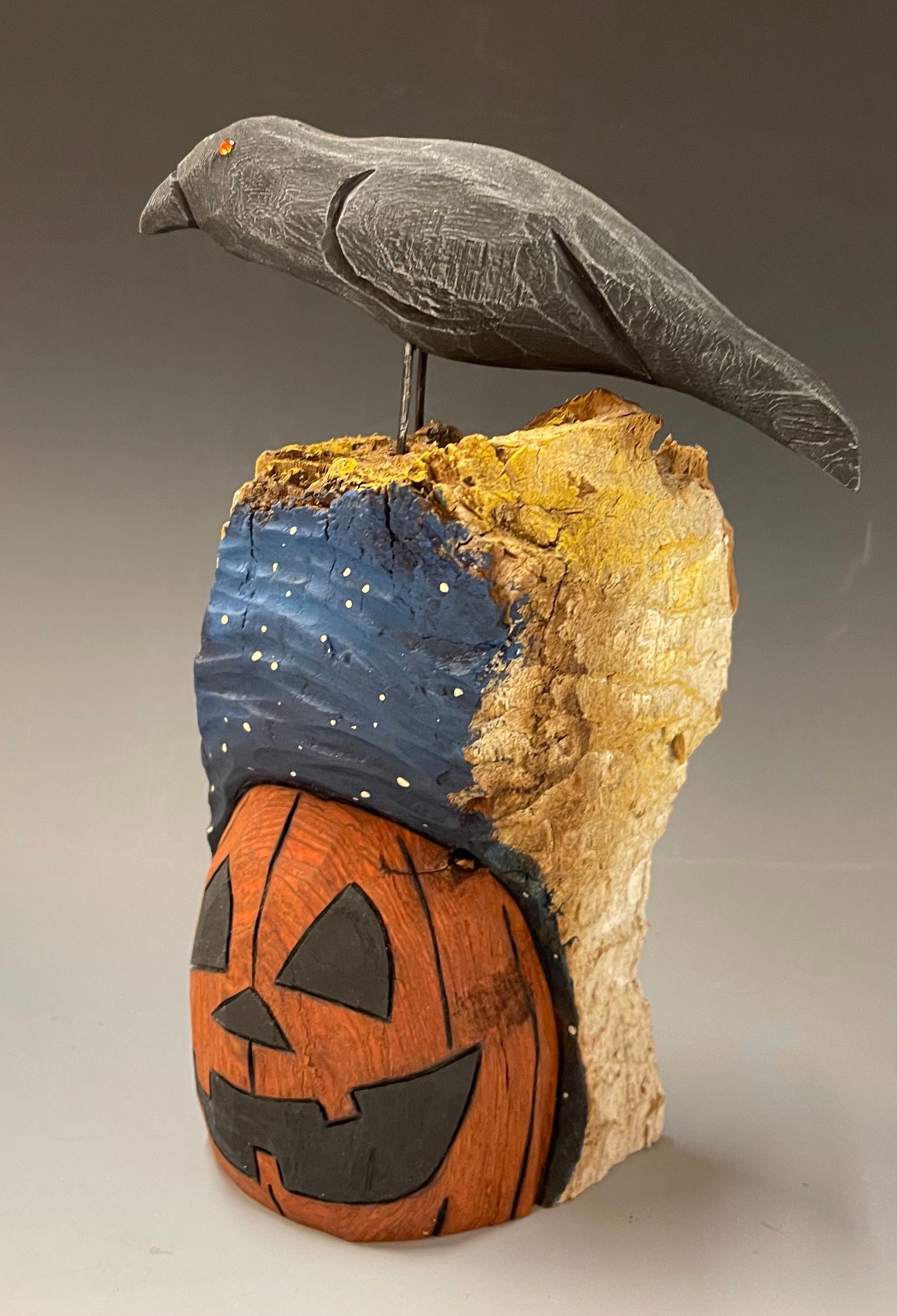 This piece is a hand carved Halloween Crow & JOL from Cottonwood Bark with a distressed finish.