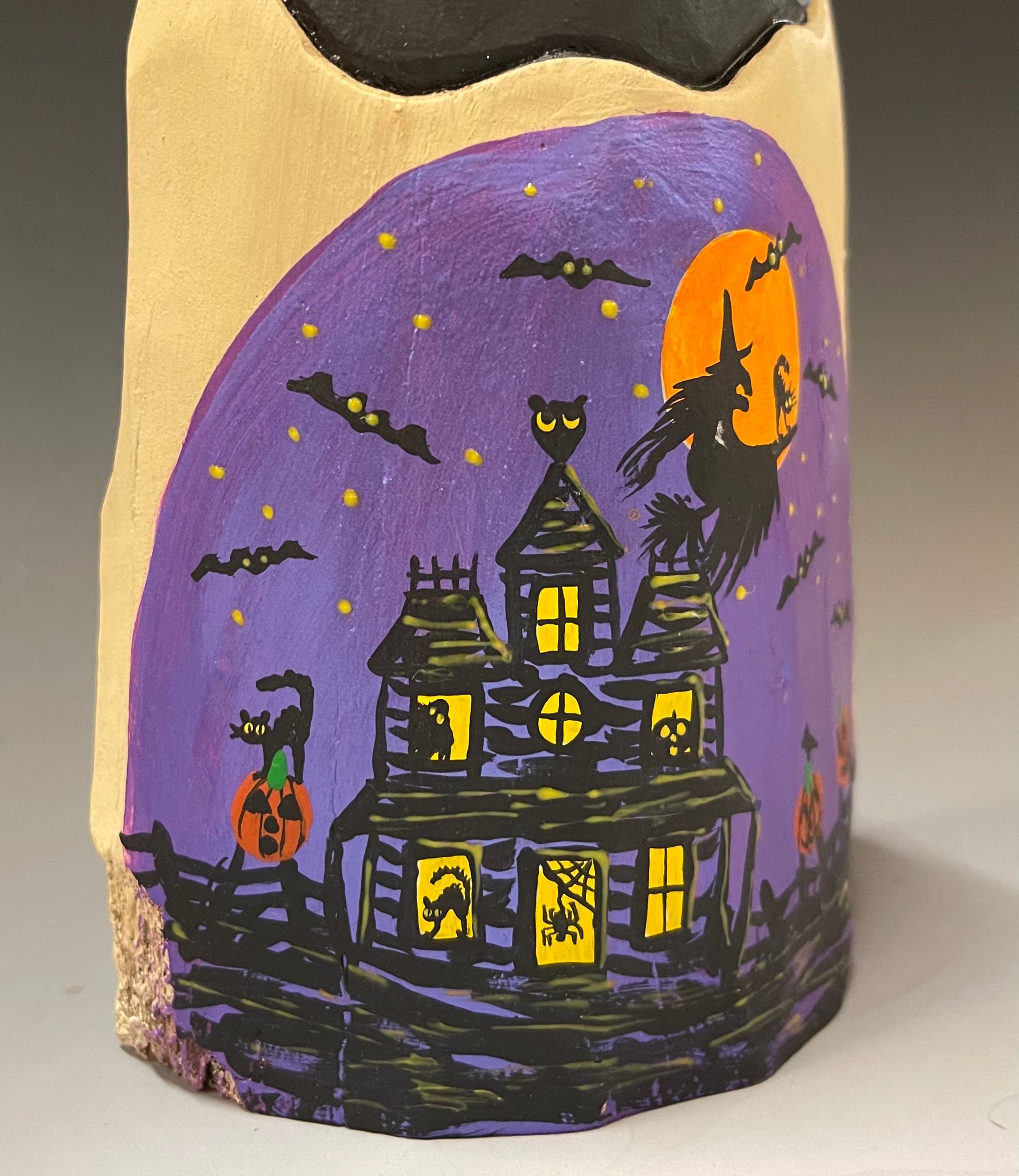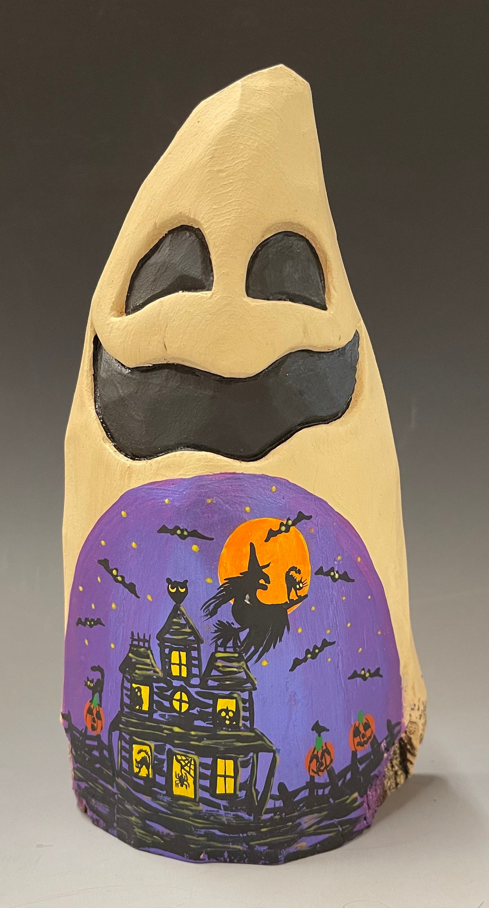 This piece is a hand carved ghost with one of Mell’s amazing hand painted Halloween scenes.