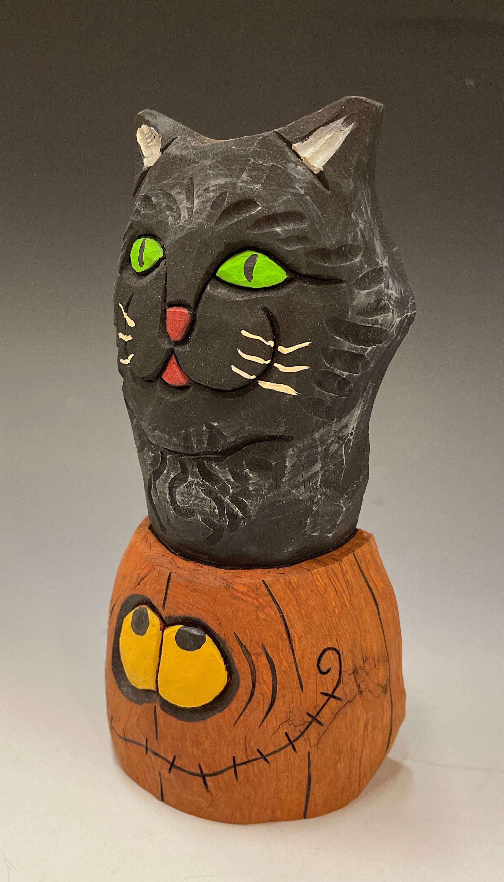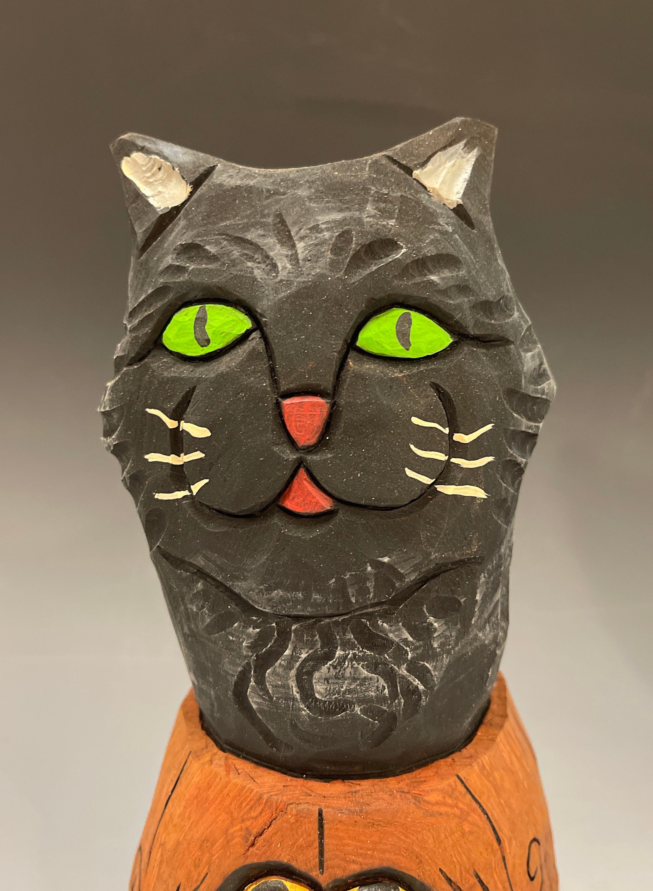 This piece is a hand carved black kitty coming out of Jack -o-lantern