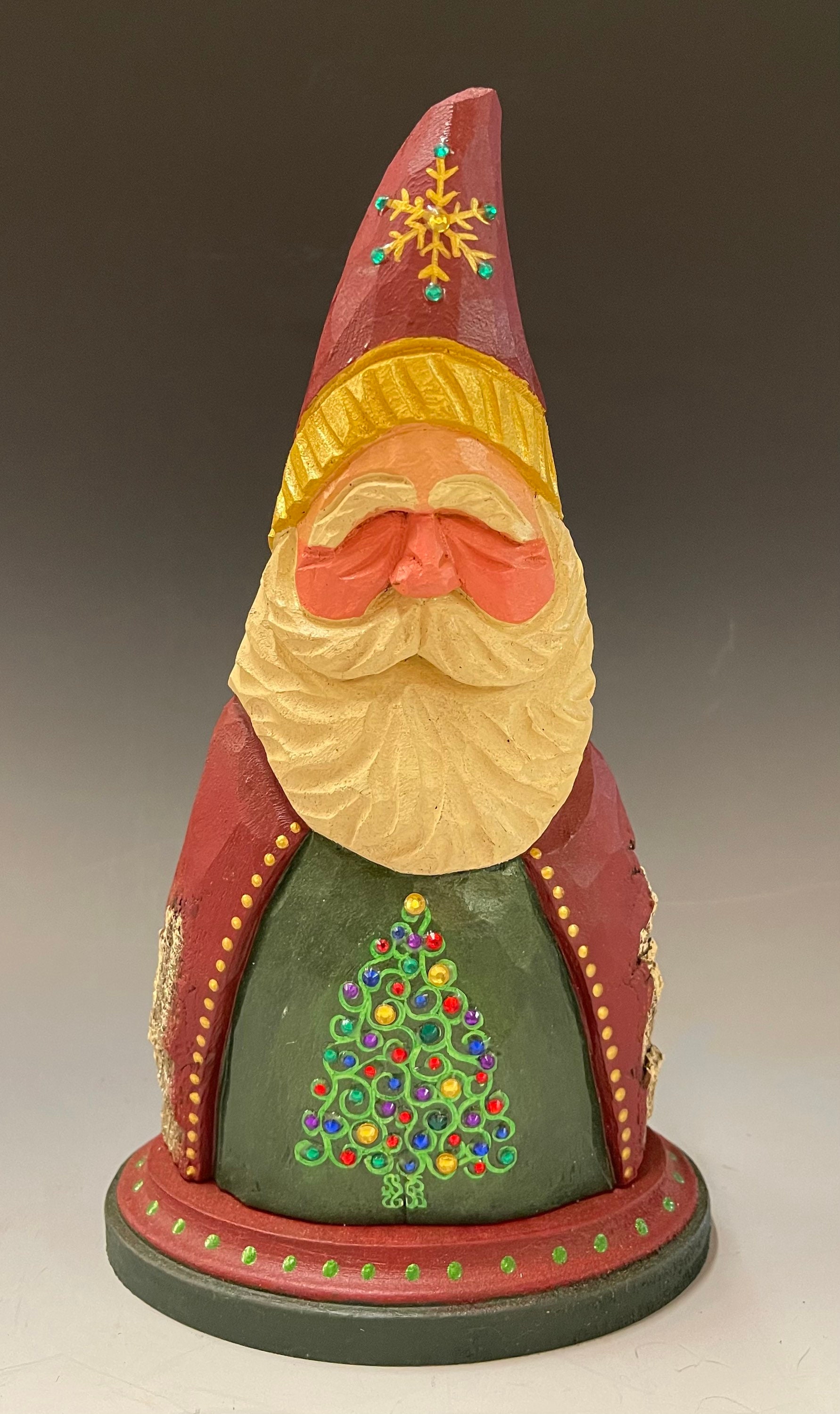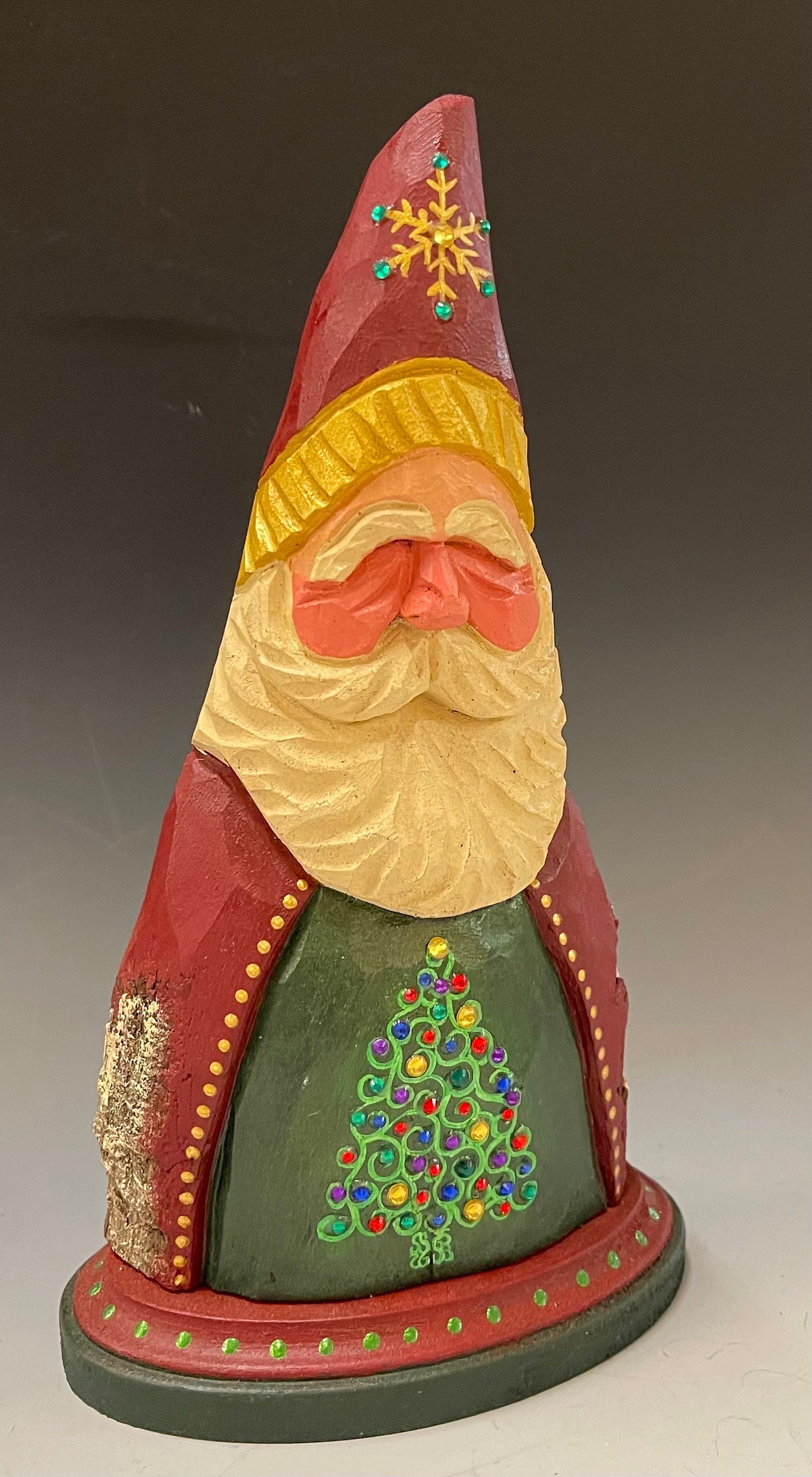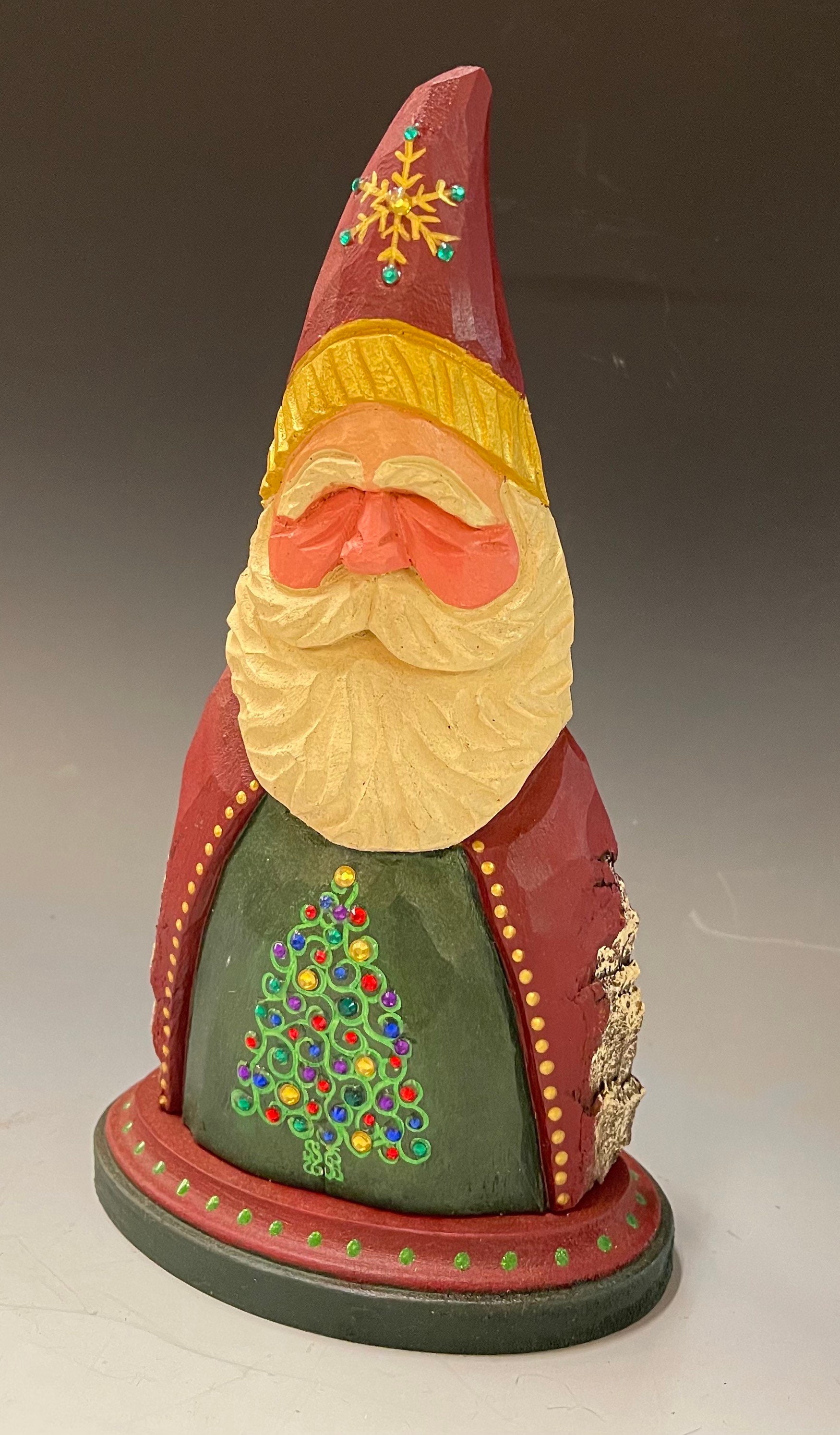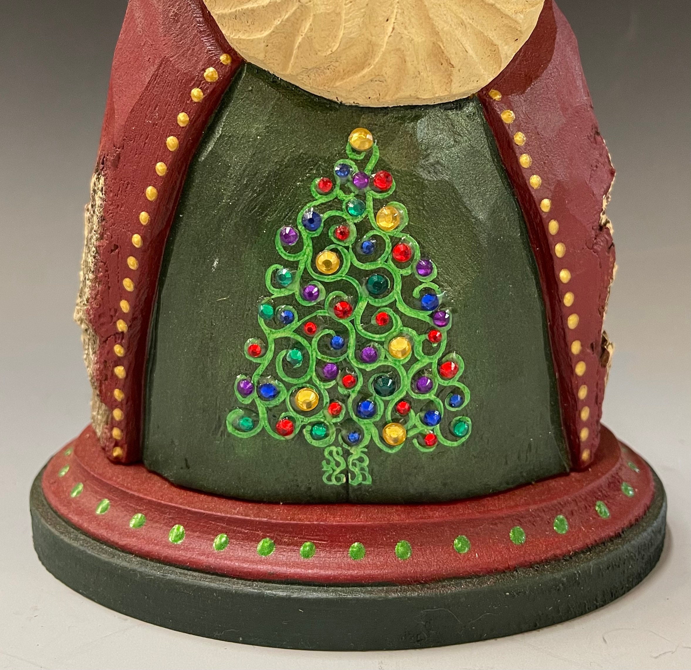 This piece is a hand carved tSanta w/ a painted & bejeweled tree from 100 year old cottonwood bark.