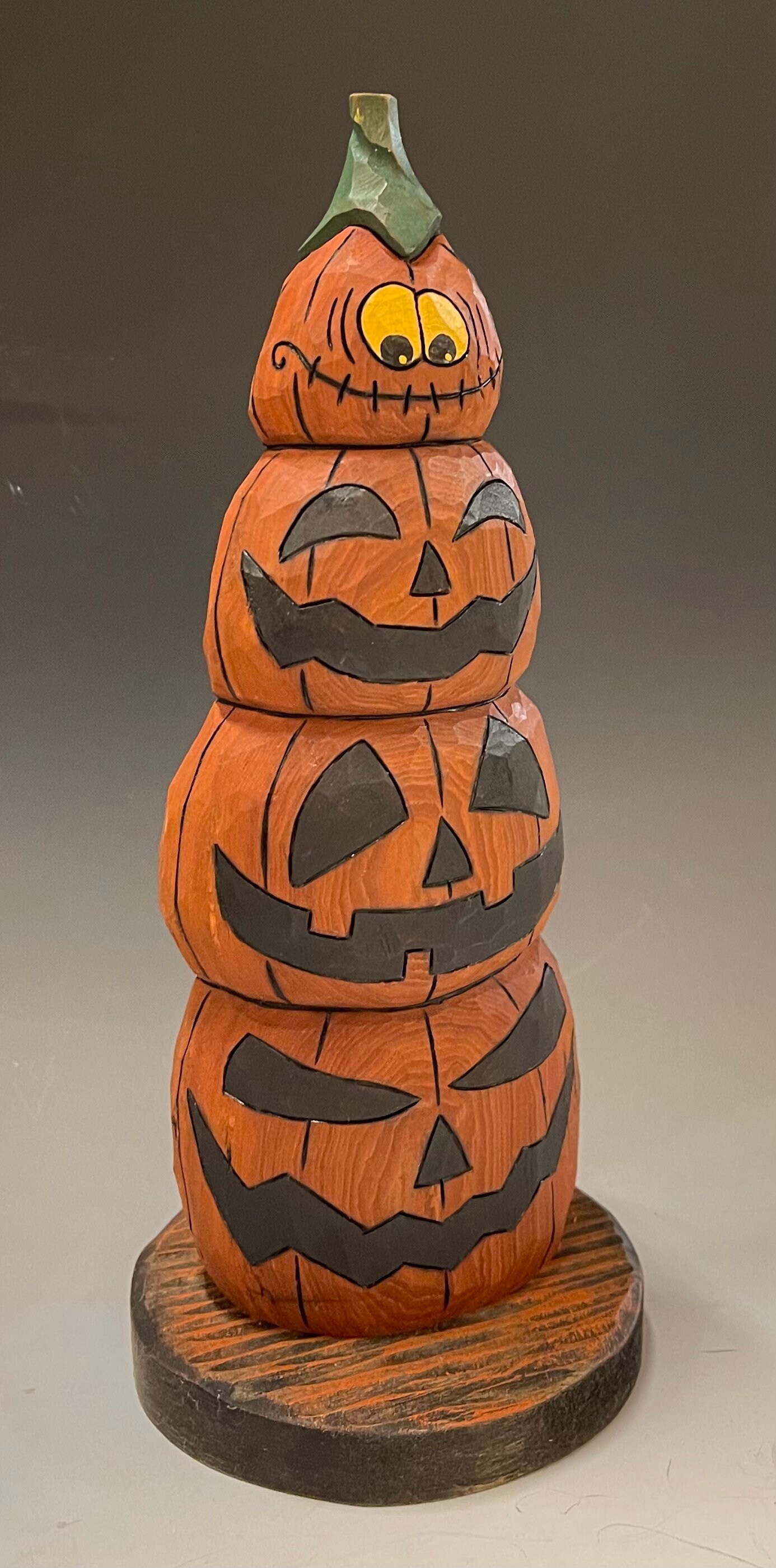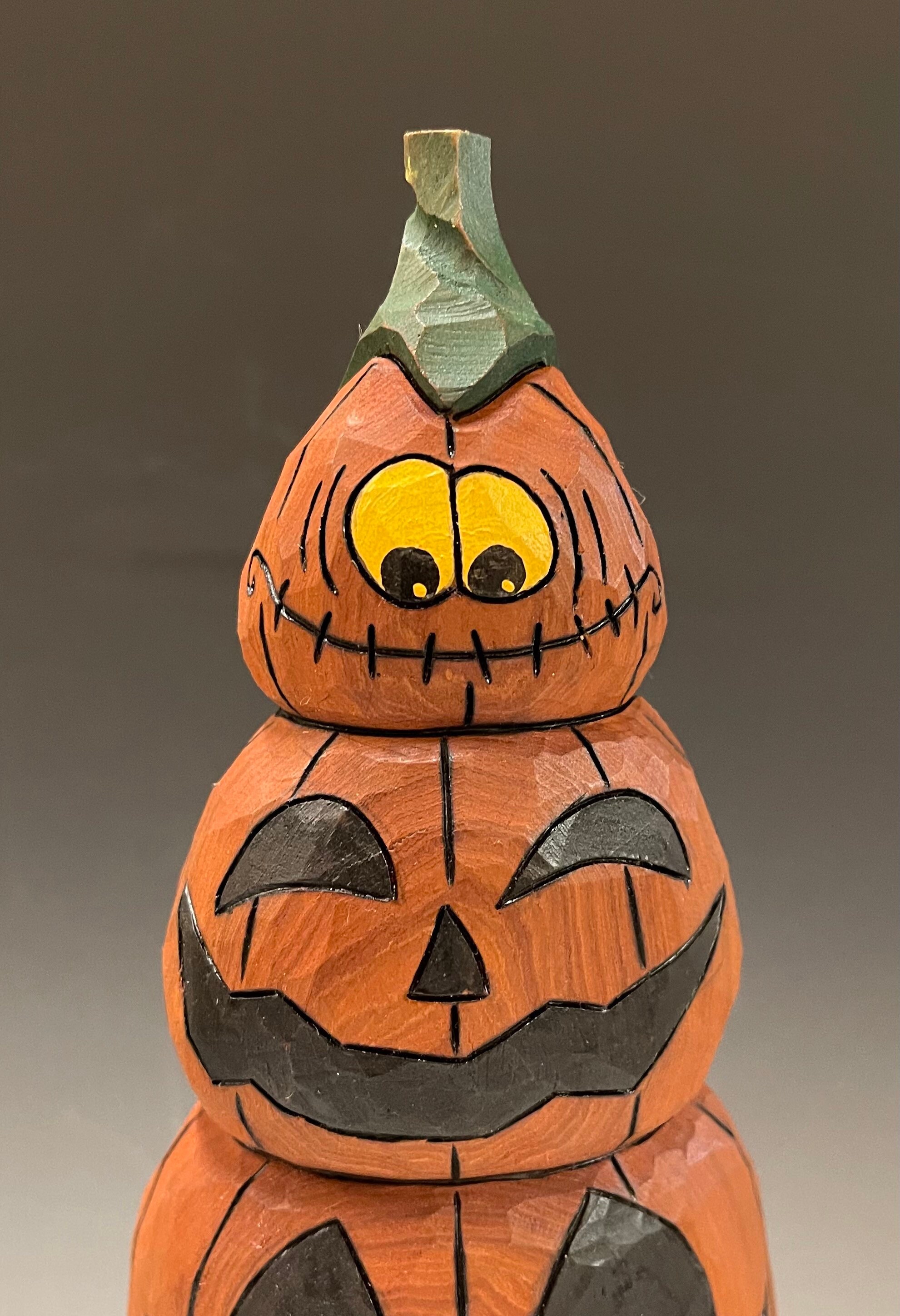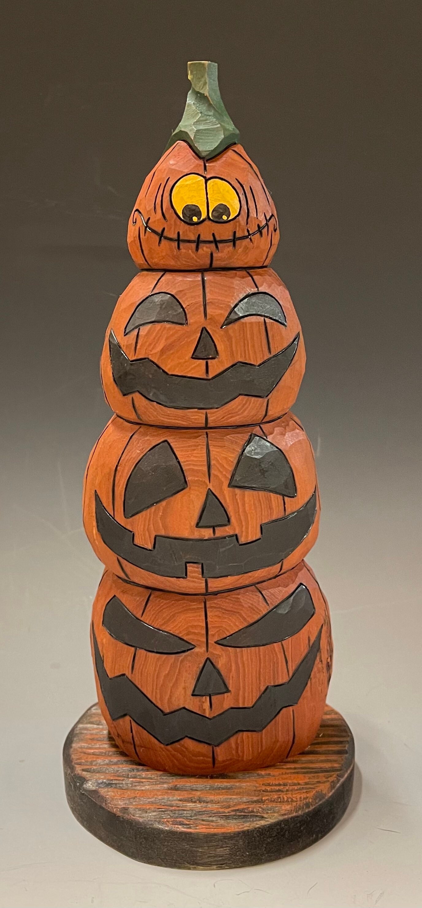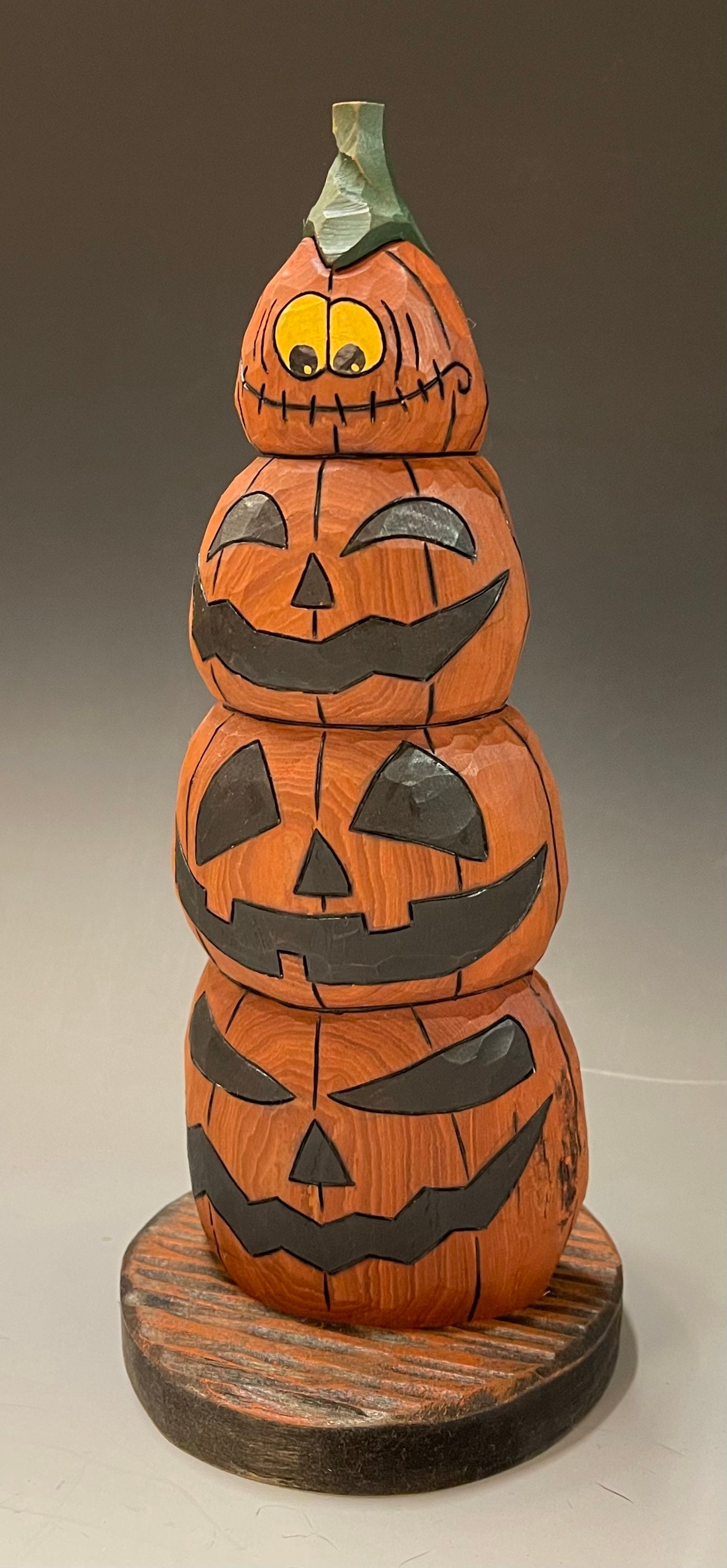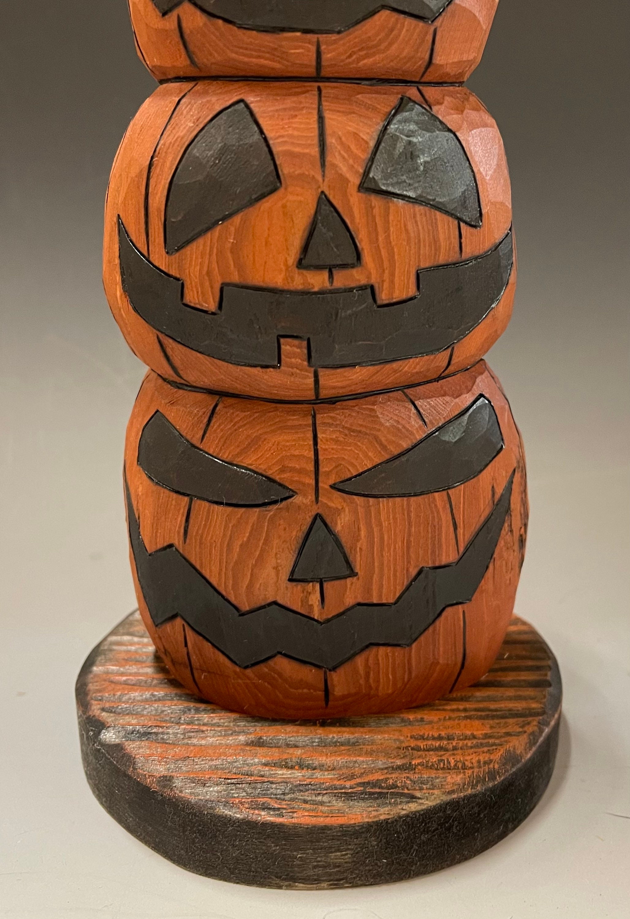 This piece is a hand carved stack of Jack-o-Lanterns.